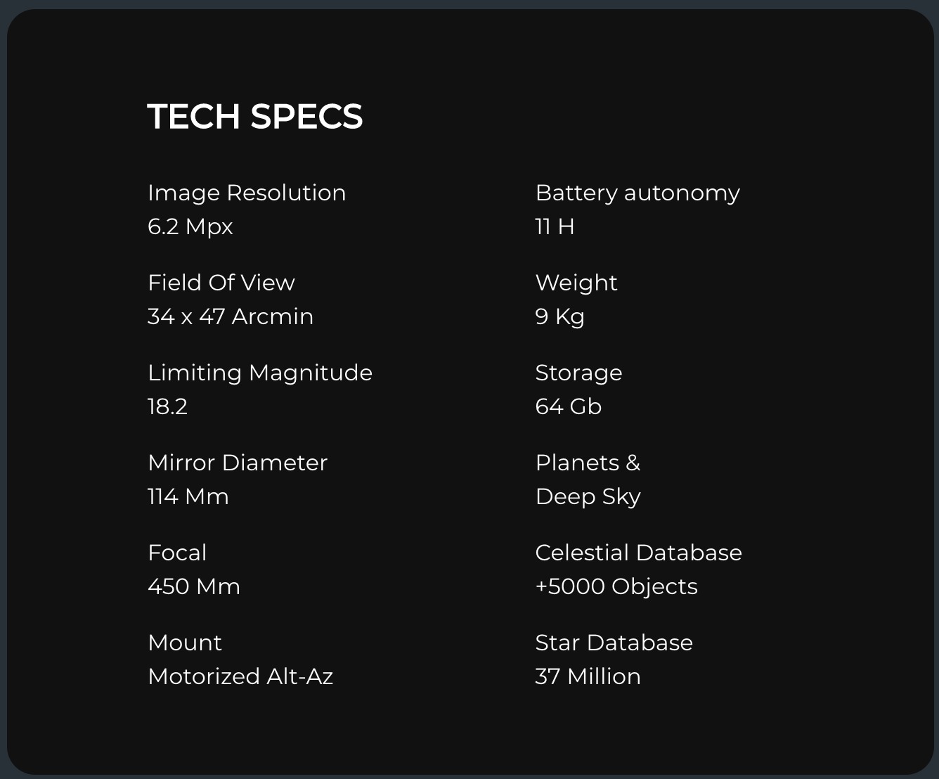 eVscope eQuinox2 集結全球最新技術,實現了全自動天文望遠鏡的功能。使用者可以自由地探索深空中的奧妙,不再需要使用傳統的黑白星圖、極軸校準、重裝備和後製等工具。透過智慧型的全自動星空觀測儀,eQuinox2 可以呈現出豐富的彩色雲氣,為使用者帶來更豐富、更直觀的天文觀測體驗。
